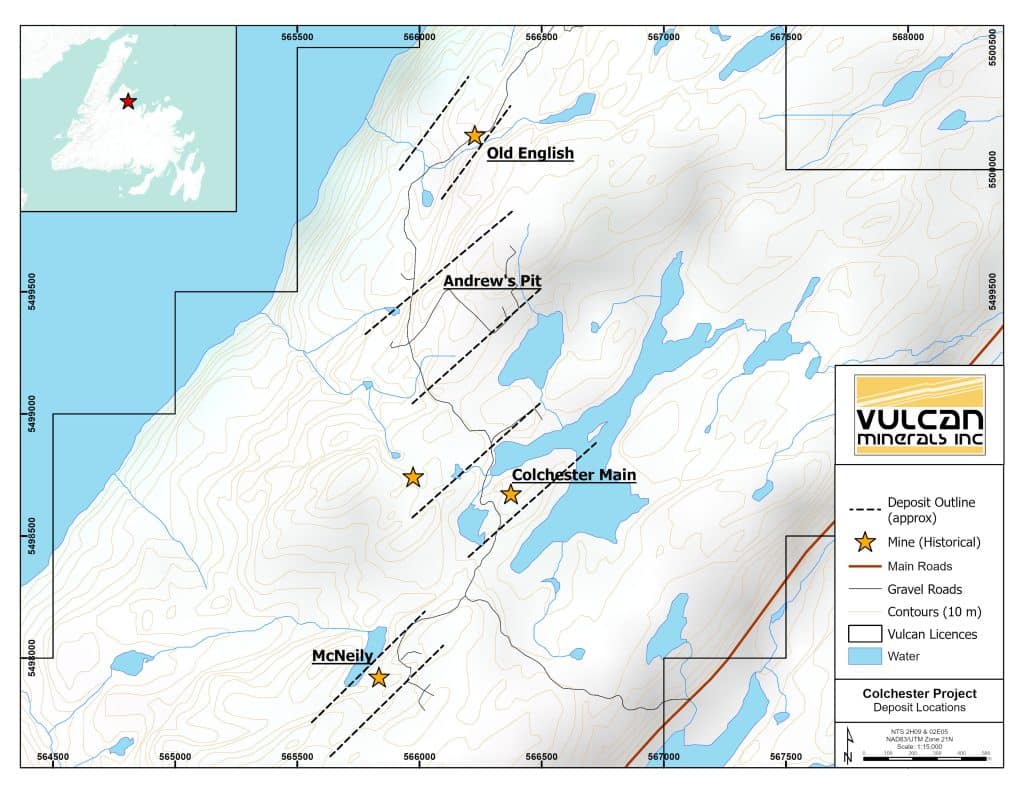 St. John’s, Newfoundland and Labrador – Vulcan Minerals Inc. (“the Company” – “Vulcan” TSX-V: VUL), provides an update on the Colchester project with a review of historical drilling and compilation incorporating the most recent drilling results. A compilation of historic drilling highlights for the Colchester project includes up to 39.97 meters of 1.03% copper and 15.8 meters of 2.19% copper. A property review is also presented including the Little Bay project.